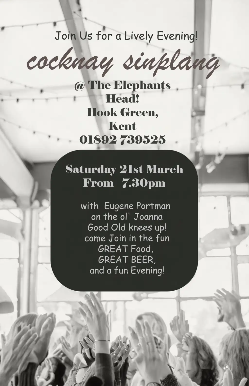 Join Us for a Lively Evening! with Eugene Portman on the ol’ Joanna Good Old knees up! come join in the fun, GREAT food, GREAT BEER and a fun evening.